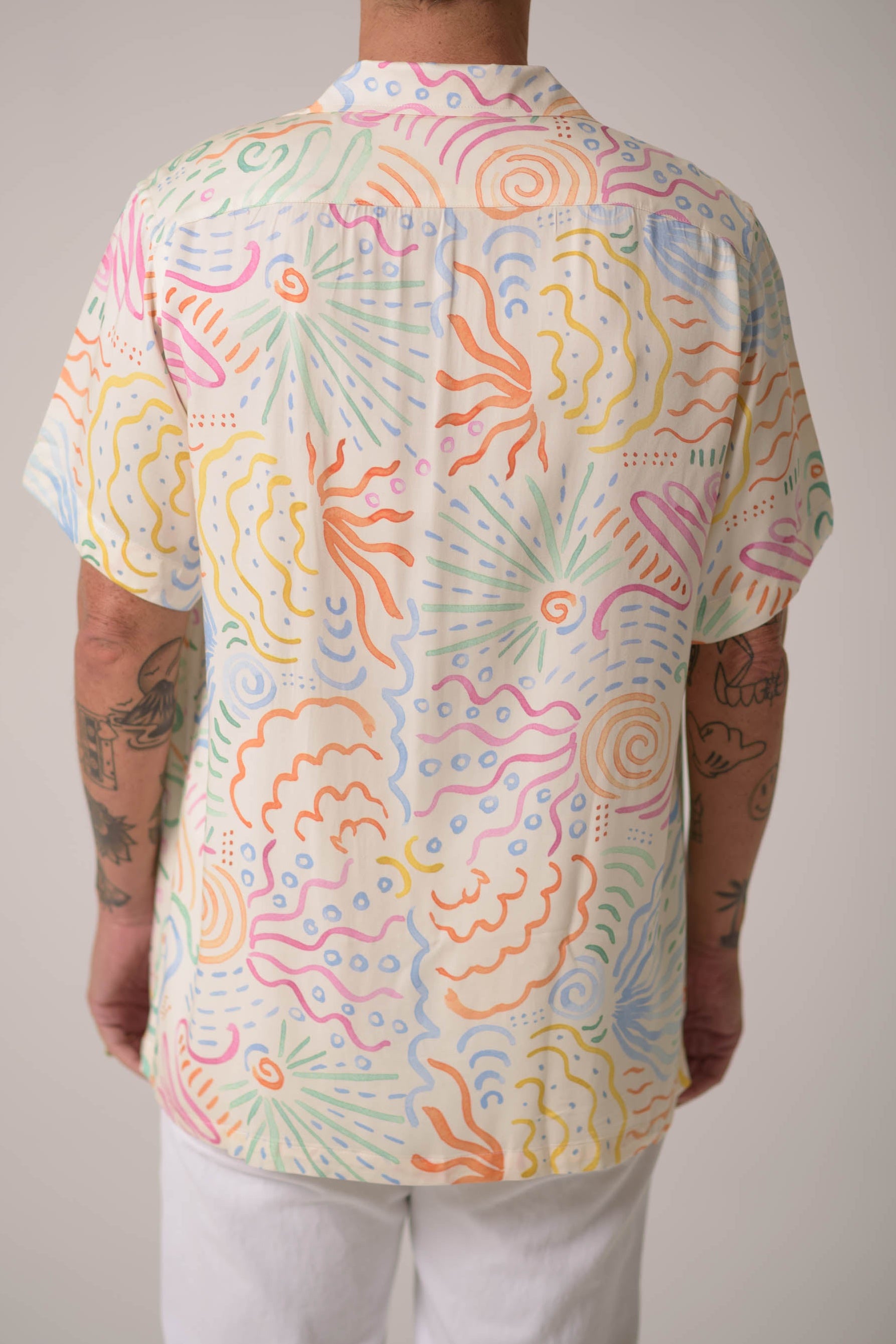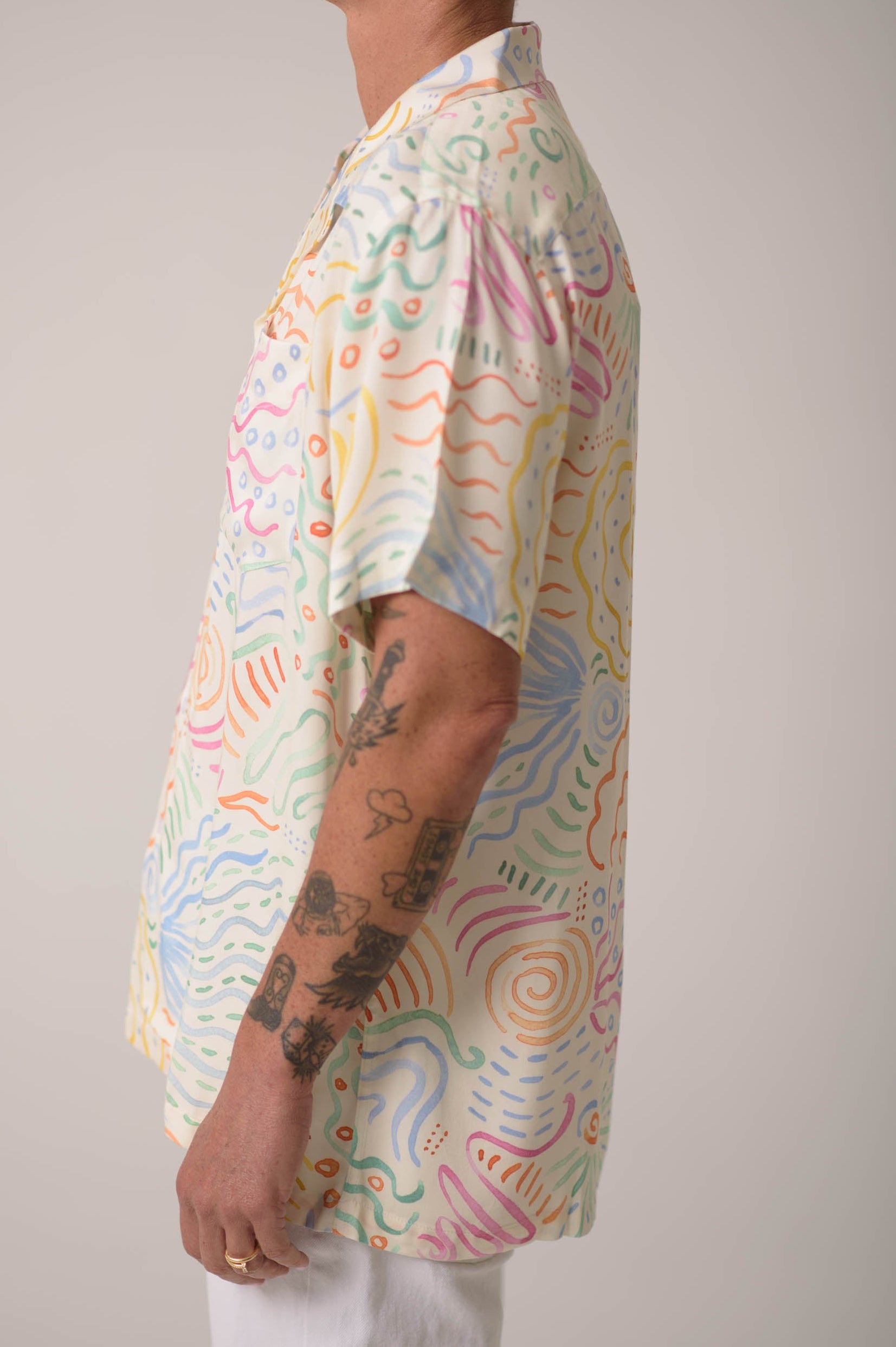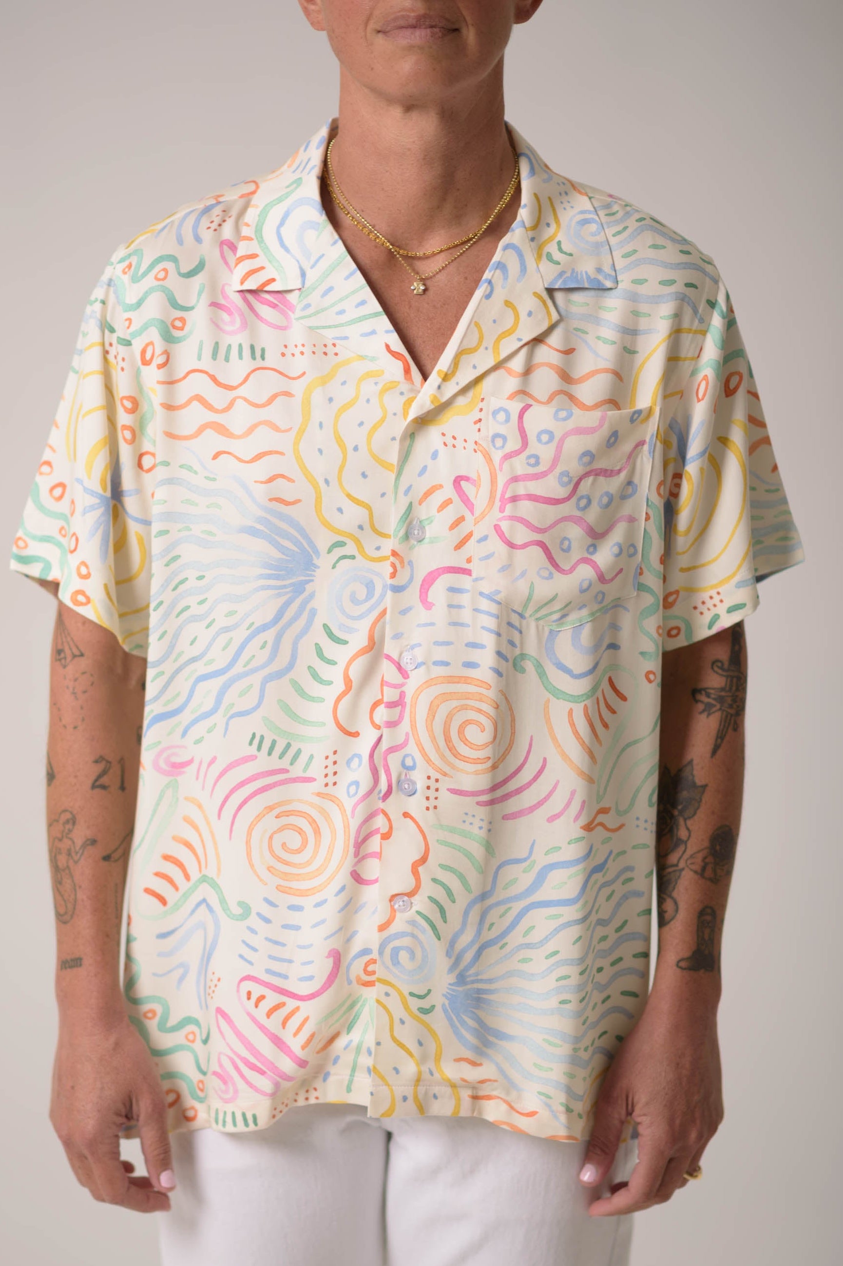 The Jewel Cabana is cut from a rayon challis in a Matisse-like multicolor print. A white base splashed with rainbow swirls, the shirt is named for the center of the San Diego art scene, La Jolla. it’s the piece that reminds us that clothing can still feel like joy, even when the world is on fire.